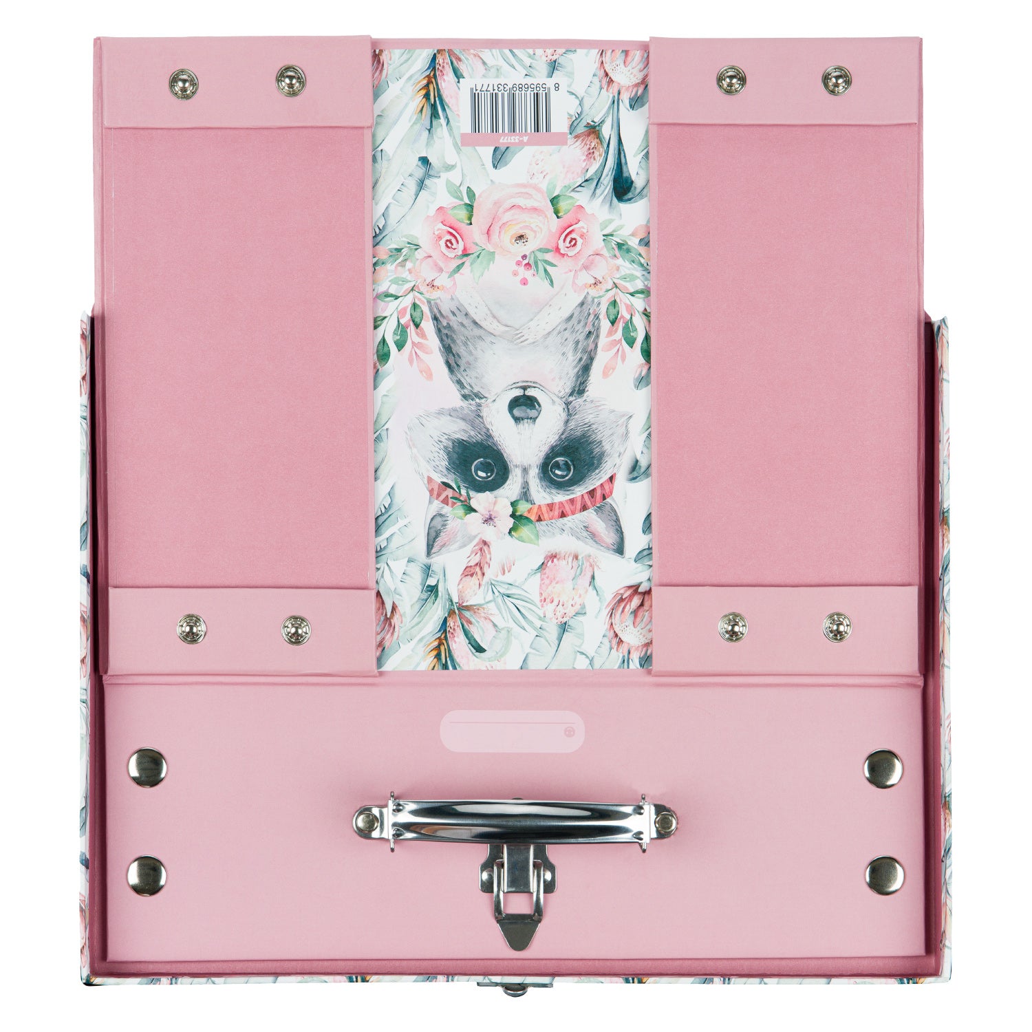 Cardboard re-folding briefcase for school or art supplies with a raccoon bear motif. Simple folding system with snap fasteners.