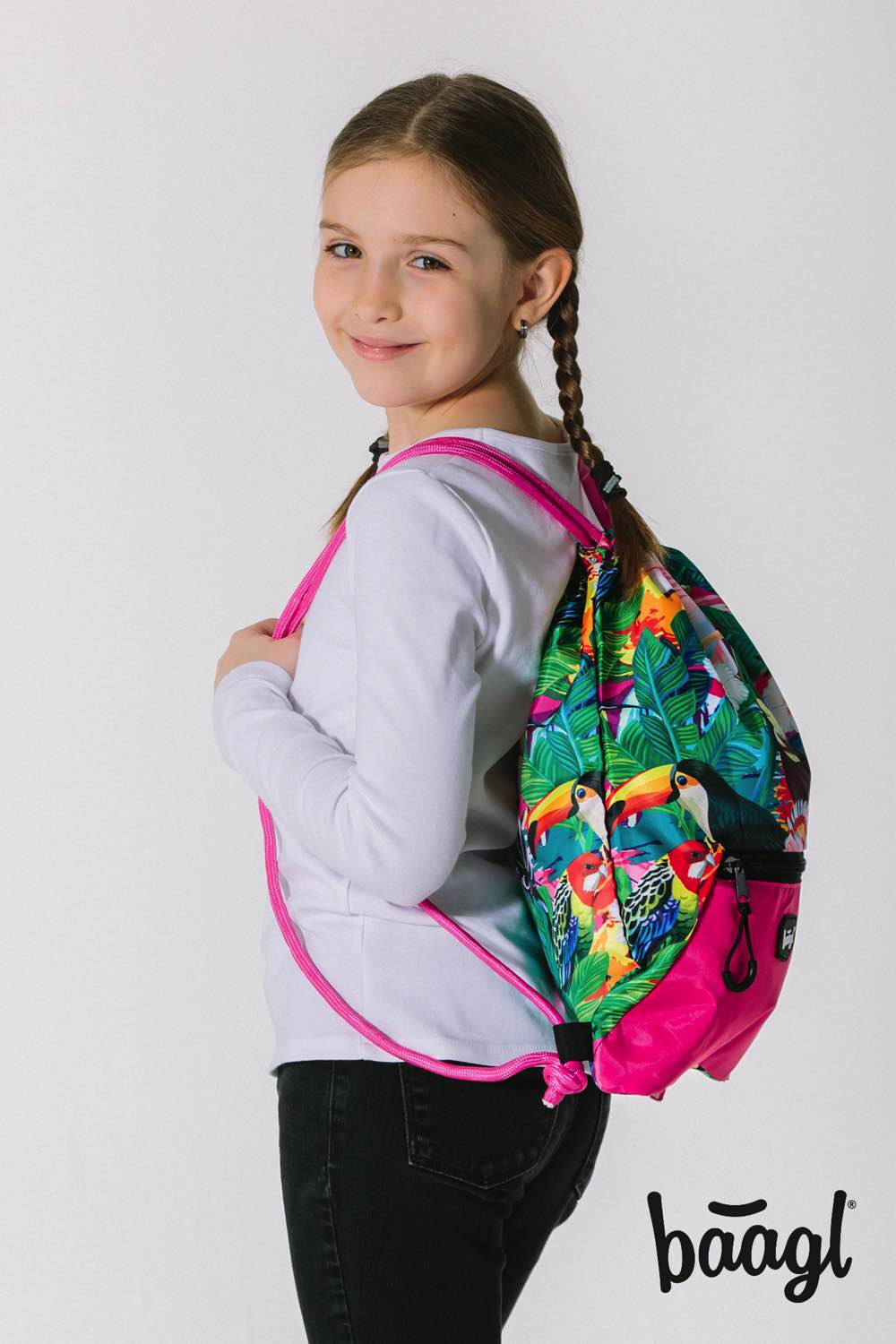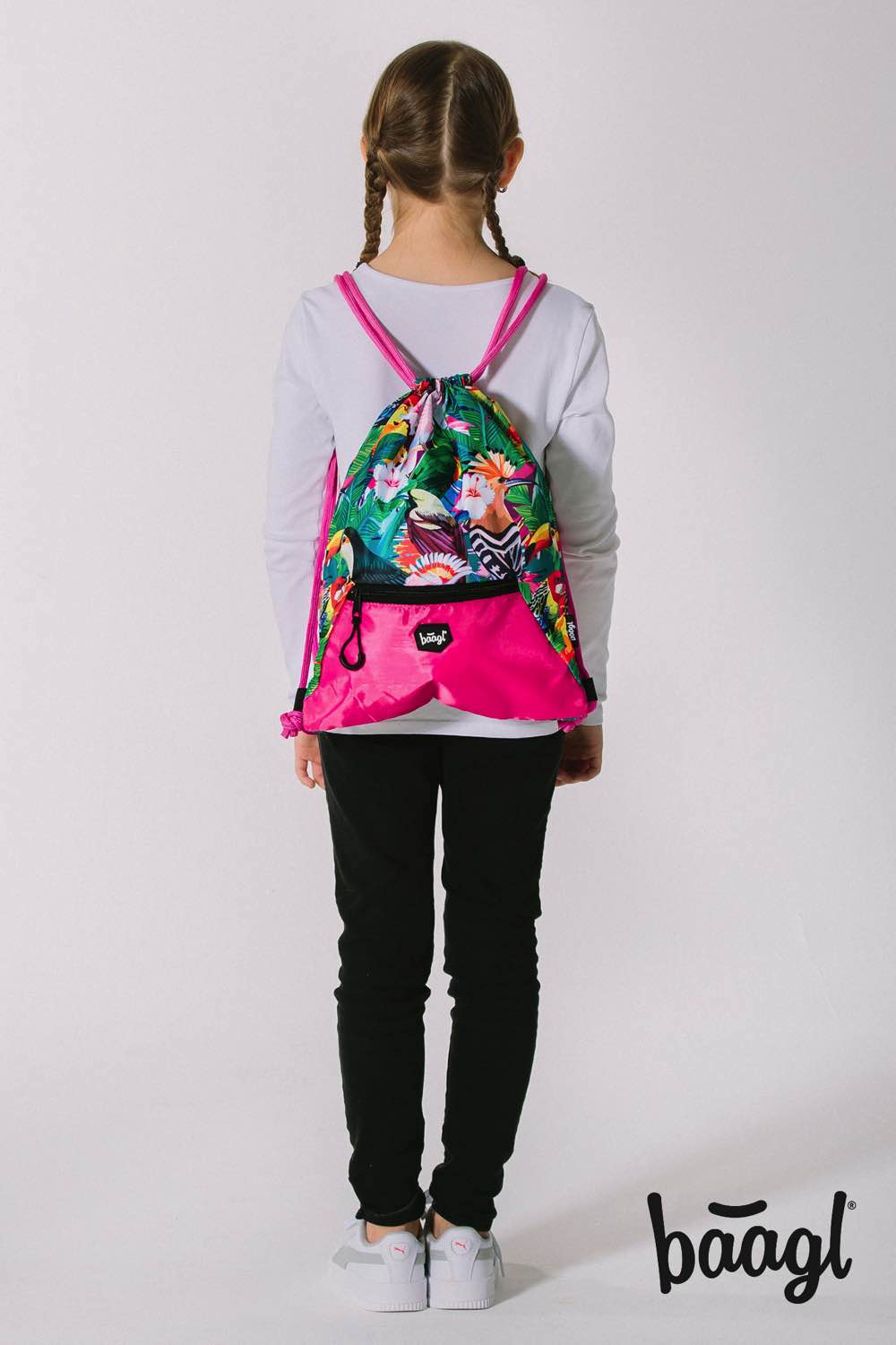 Gym sack Toucan with a print of tropical parrots and a distinctive zip pocket.