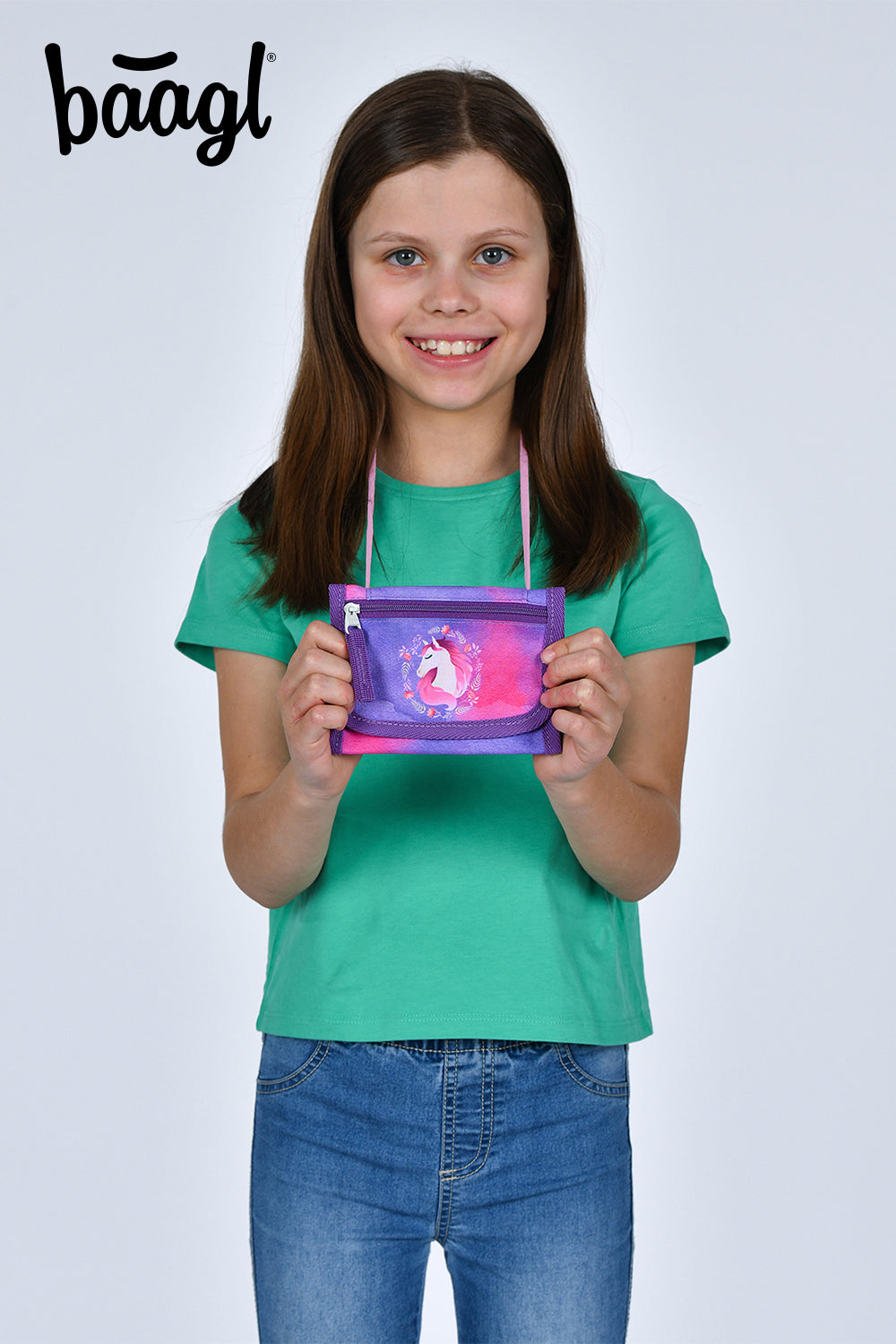 Purple wallet with horse motif and lanyard with safety lock for comfortable and safe wearing around the neck.