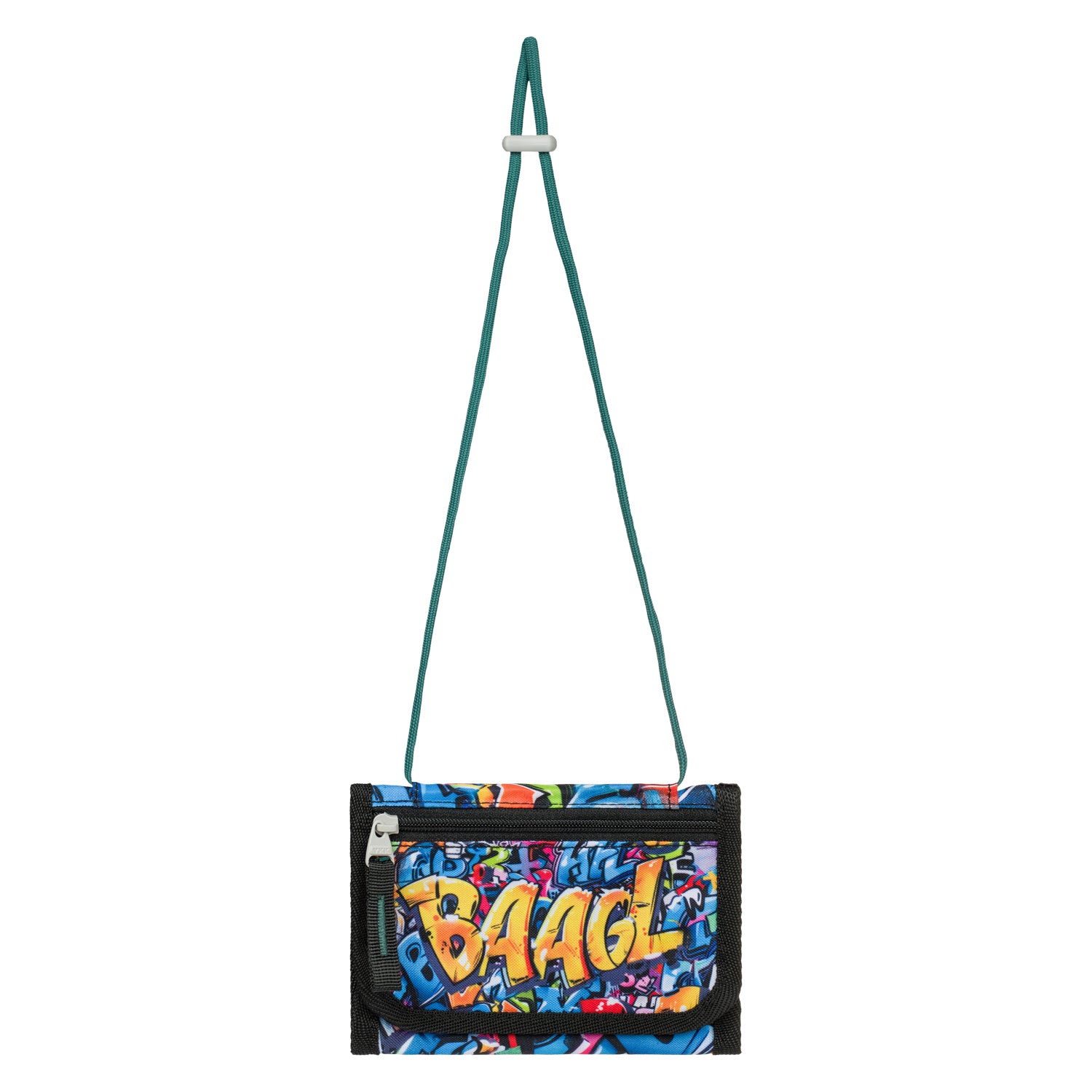 Practical wallet with a skatepark motif and a lanyard with a safety lock for comfortable and safe wearing around the neck.