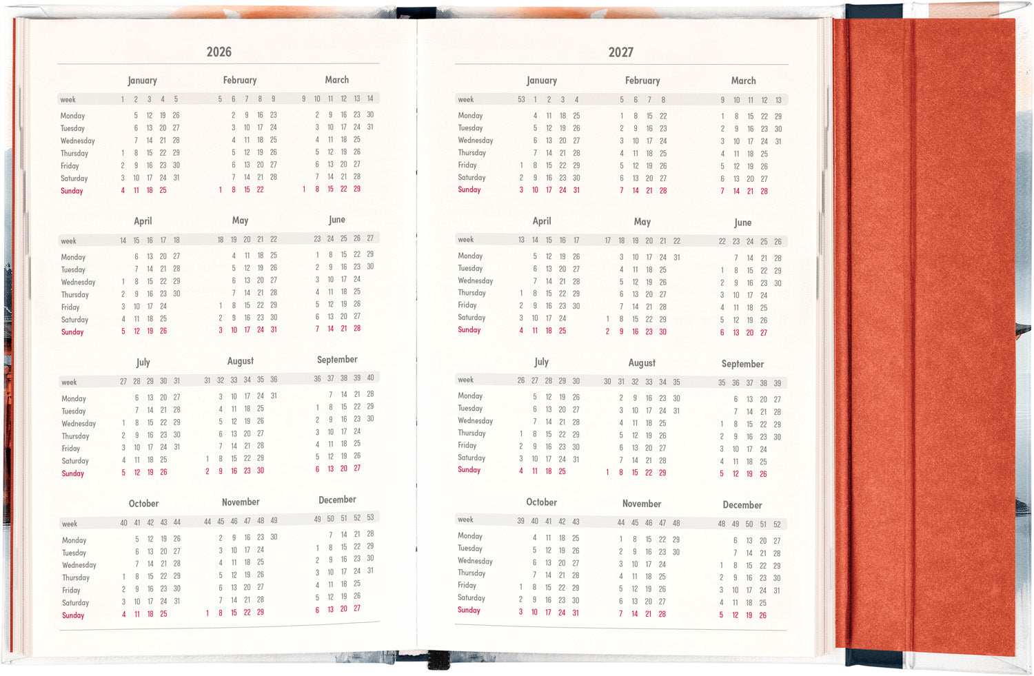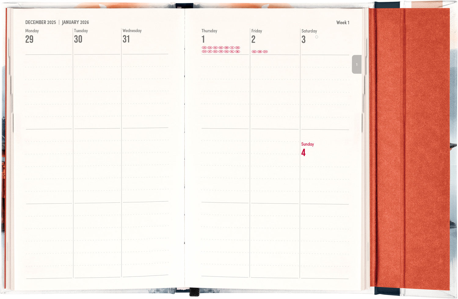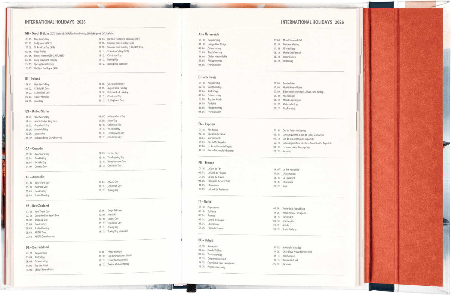 This weekly diary in English with international holidays and a practical magnetic closure is the ideal choice for those who want to keep their plans clearly under control. It offers a column layout of individual weeks with plenty of space for daily notes. It includes practical monthly overviews, ideal for planning holidays or vacations.