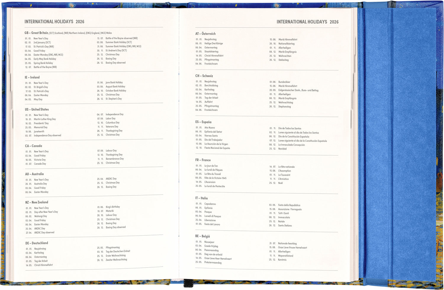 This weekly diary in English with international holidays and a practical magnetic closure is the ideal choice for those who want to keep their plans clearly under control. It offers a column layout of individual weeks with plenty of space for daily notes. It includes practical monthly overviews, ideal for planning holidays or vacations.