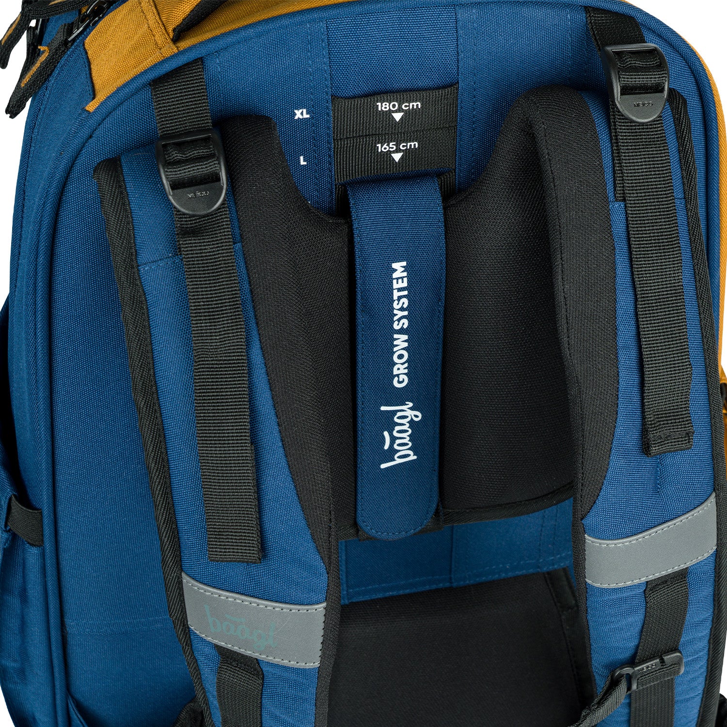 The designer Skate Max Duo school backpack with BAAGL logo and skateboard straps has a removable waist belt and can be adjusted to four different height sizes thanks to the sliding back system.