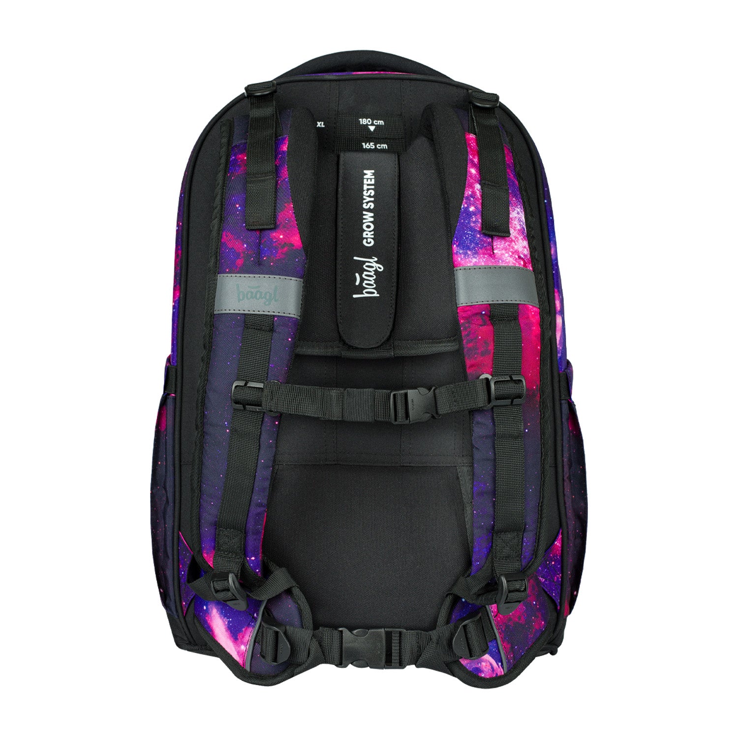 This designer school set with a galaxy motif includes an ergonomic Skate Max backpack with BAAGL logo and skateboard straps, a school pencil case and a gym sack.