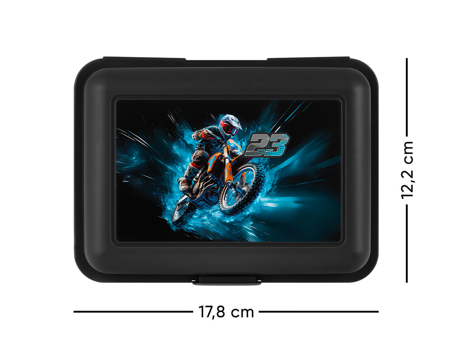 This practical snack box features a motorcycle motif and includes an adjustable partition for separating food.