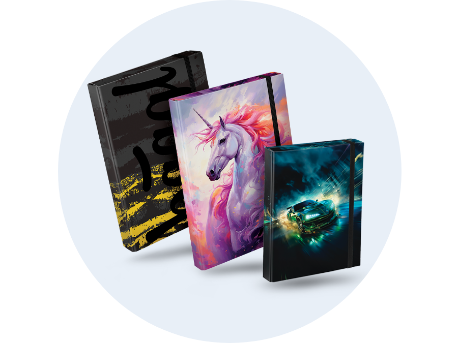 Sturdy A4-size lacquered notebook folder, in a racing car theme. Protects notebooks from getting creased and helps keep the school bag organised.