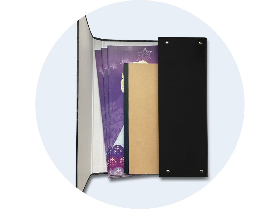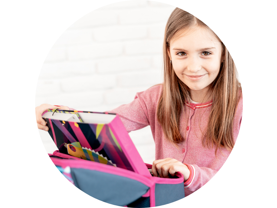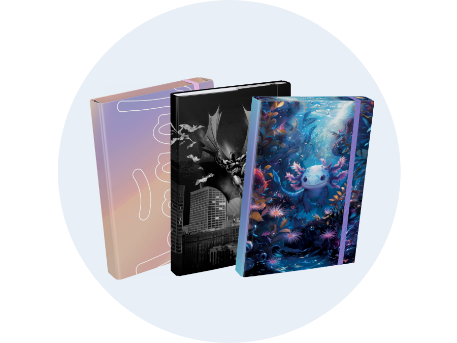 • Folder secured with an elastic band for storing exercise books or documents, with a flap inside to stop them from falling out.