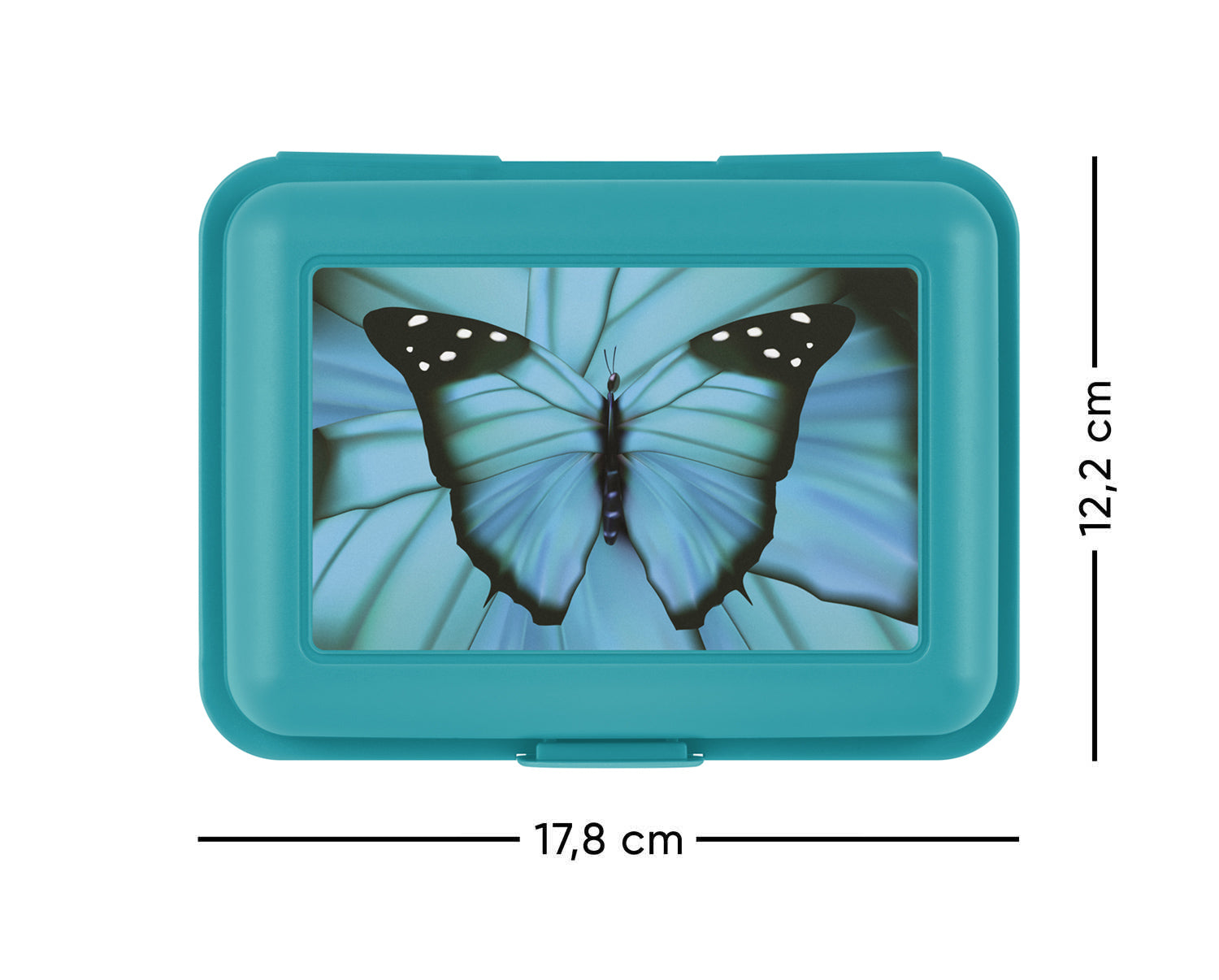The stylish design of this turquoise butterfly snack box will delight both little and bigger schoolgirls.