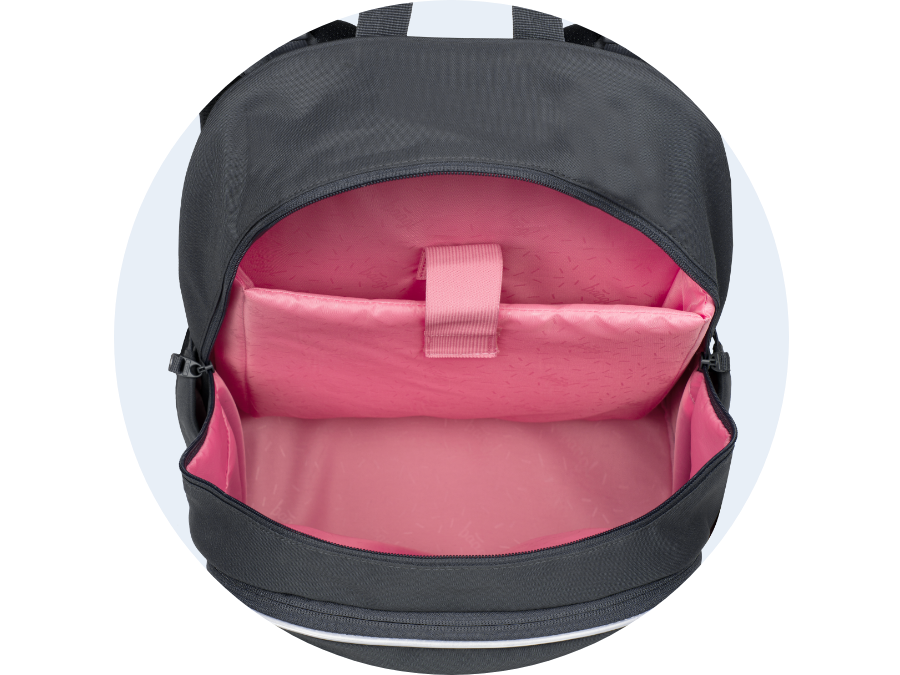• Ergonomic school backpack with three separate zippered compartments, internal organiser, and pocket for up-to 15-inch laptop or tablet.