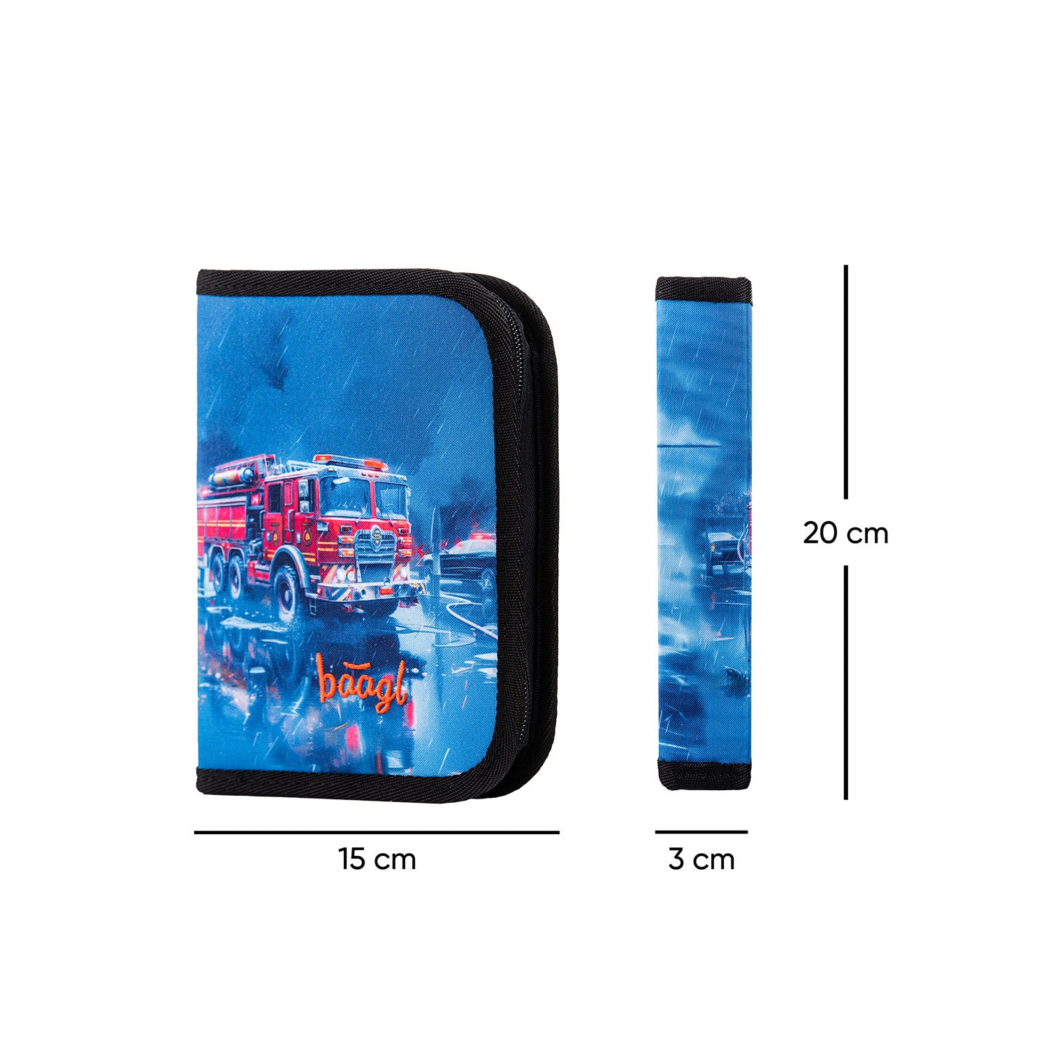 Classic single-tier pencil case with a rescue truck motif and a practical pocket for small items.