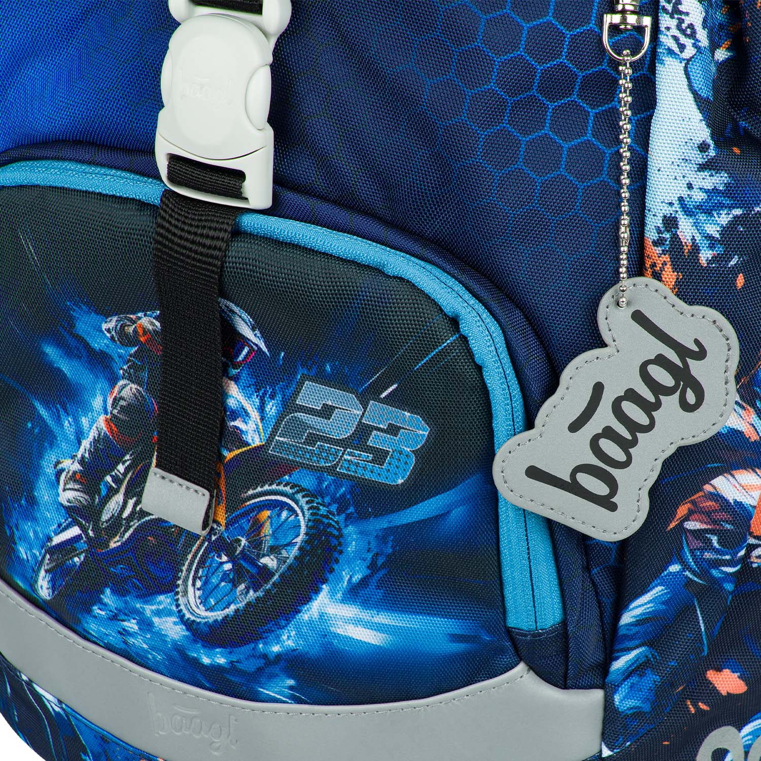 This boys' backpack features a motorcycle motif and is suitable for children from the first grade of primary school. It is lightweight and practical, with an intuitive front pocket fastening. Reflective elements are included to help ensure safety.