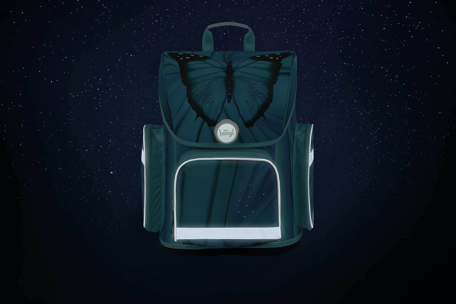 Ergo Butterfly school backpack in a striking turquoise colour, complete with pictures of butterflies. The backpack is suitable for 1st - 2nd grade of elementary school.