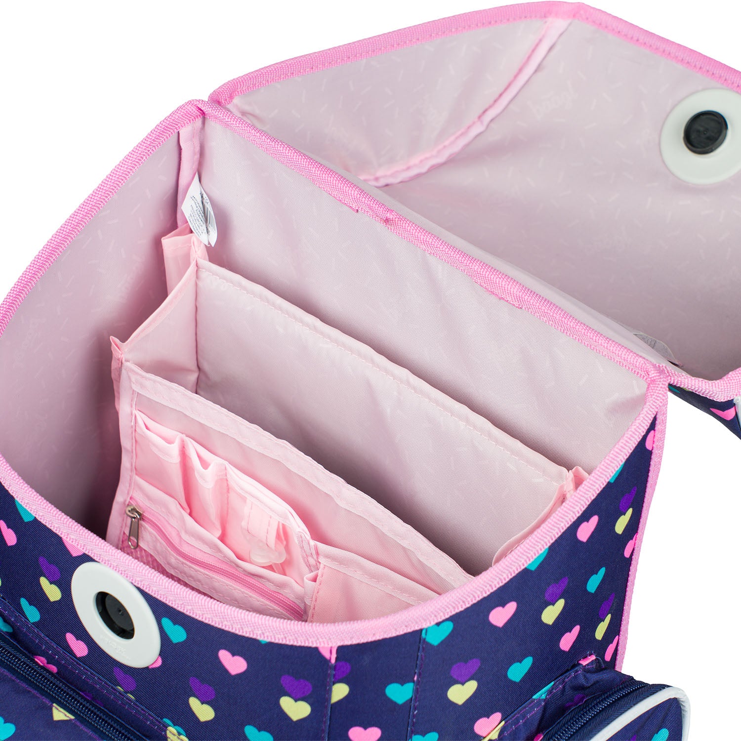 The Ergo school bag features a spacious main compartment with an internal organizer to ensure even weight distribution, an insulated front pocket for snacks, and two side pockets perfect for a drinks bottle or slippers.