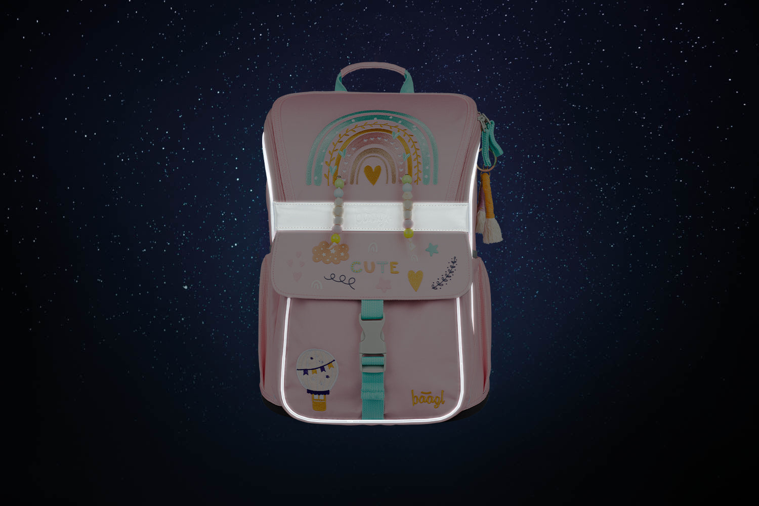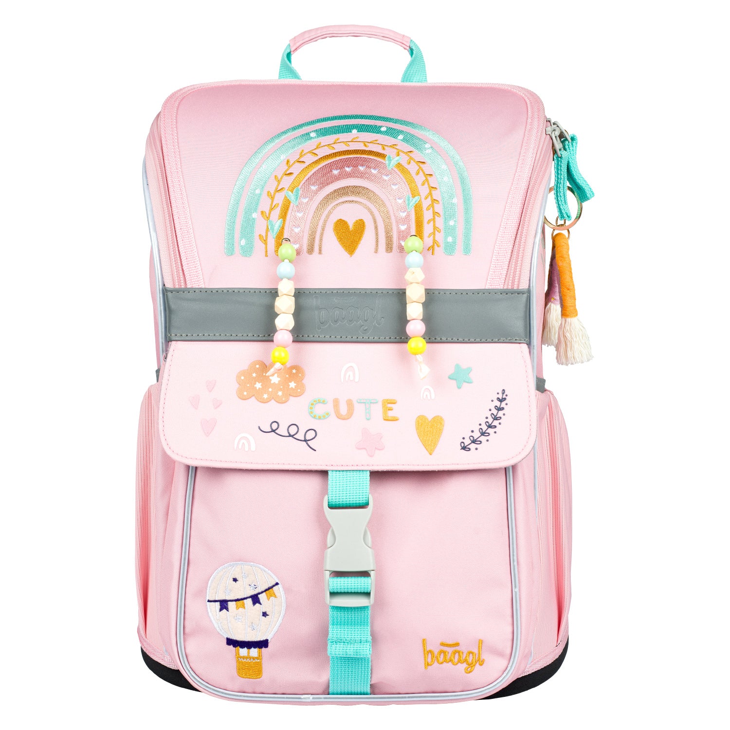 This pastel pink school bag with attractive beaded rainbow embroidery will delight any little school girl. It has a sliding back system that can be adjusted to fit the child's height and a flip-open system for easy access to supplies.