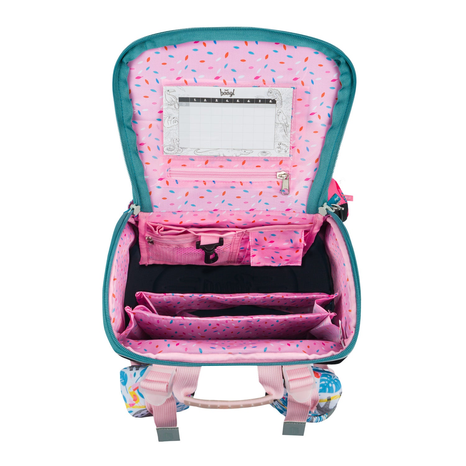 • The bag has an innovative new folding opening system, which makes it easier for students to see and access the contents directly from the desk.