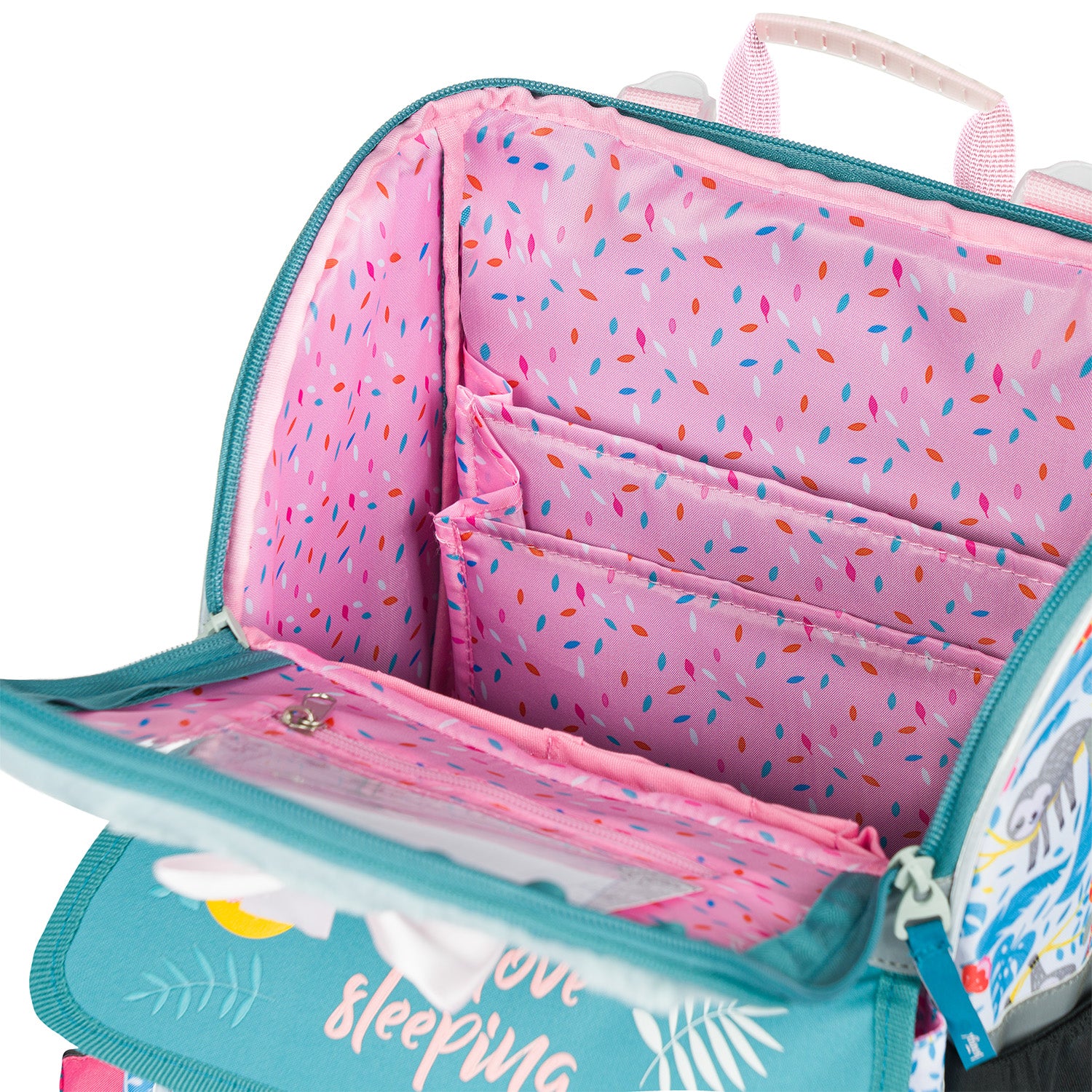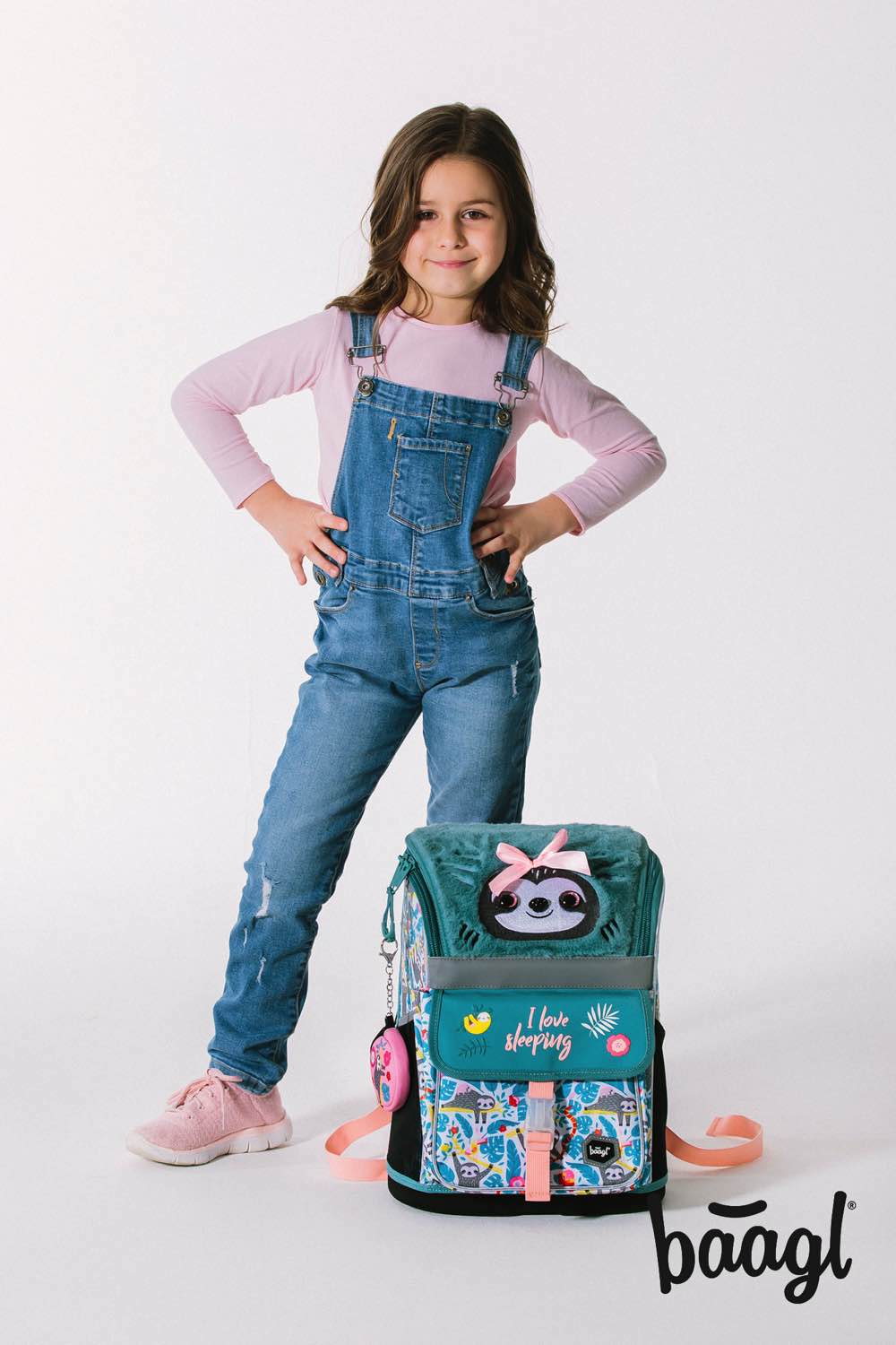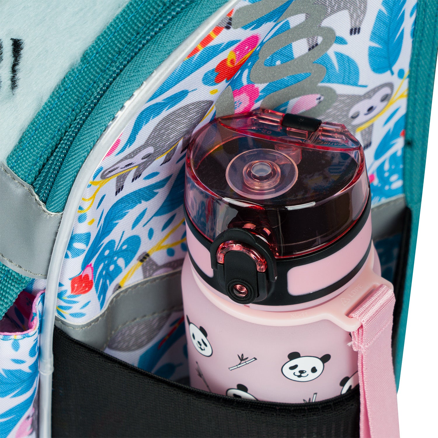 School bag Zippy Sloth with a fluffy flap and a picture of a cute sloth.