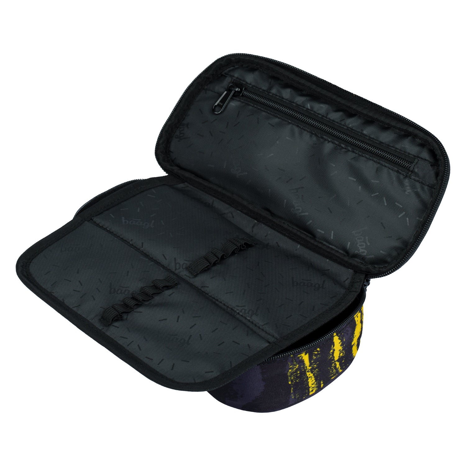 Spacious black and yellow pencil case with BAAGL logo, made from recycled materials. It has a main compartment and a flap pocket with a divider and elastic bands for pencils and other writing implements.