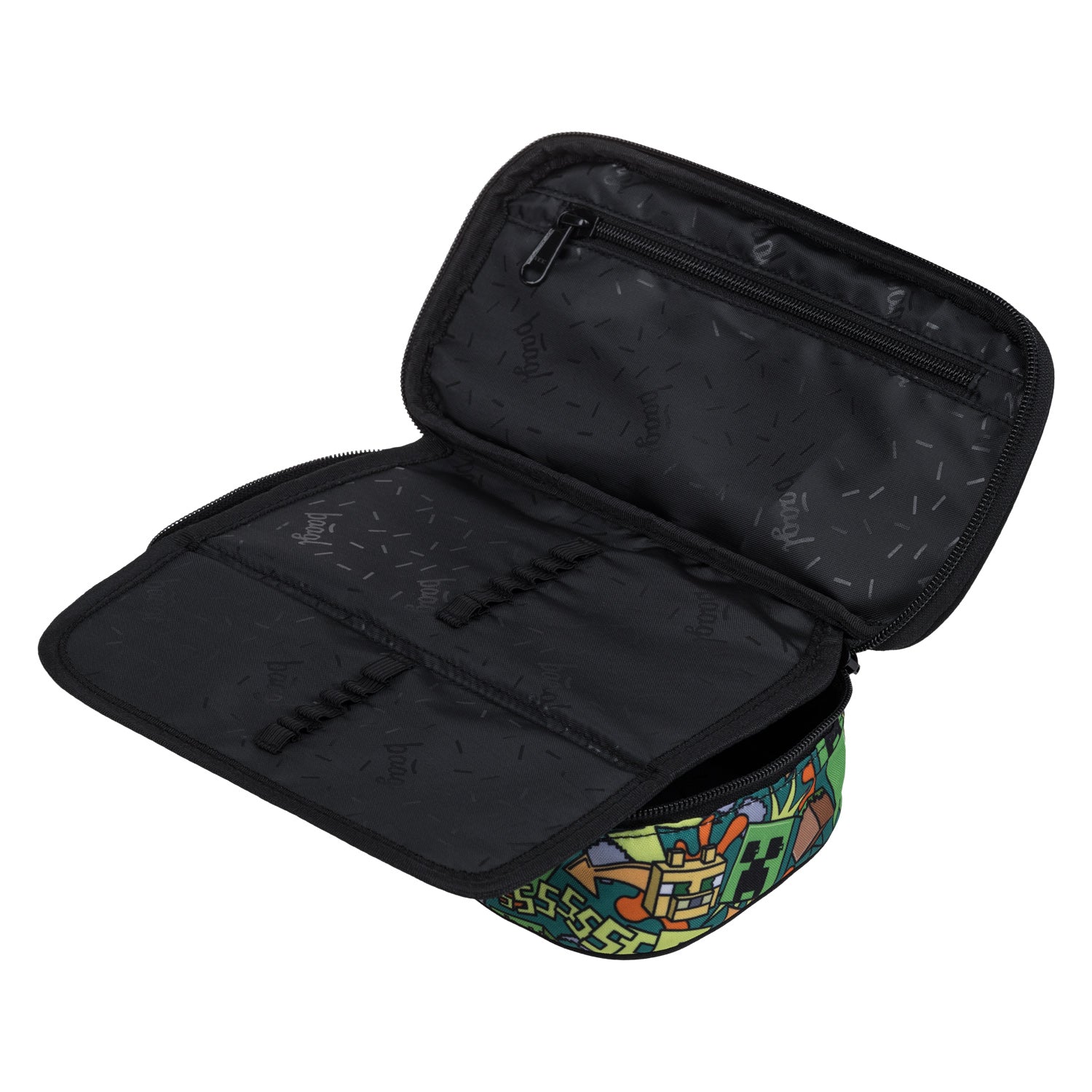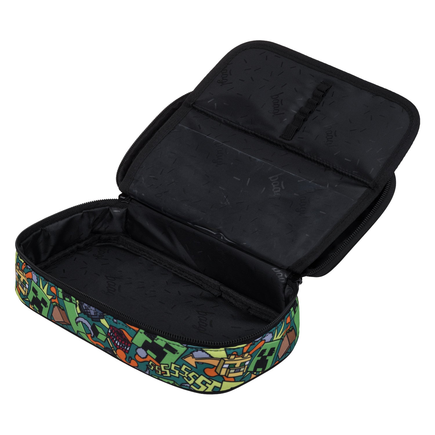 A practical pencil case with a hinged flap for organising writing tools. An ideal school accessory, especially for Minecraft fans.