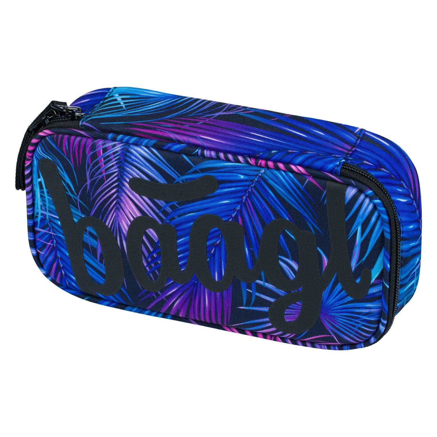 This pencil case featuring a leaf design and the BAAGL logo is spacious and made from recycled materials. It has a main compartment and a flap pocket with a divider and elastic bands for pencils and other writing implements.