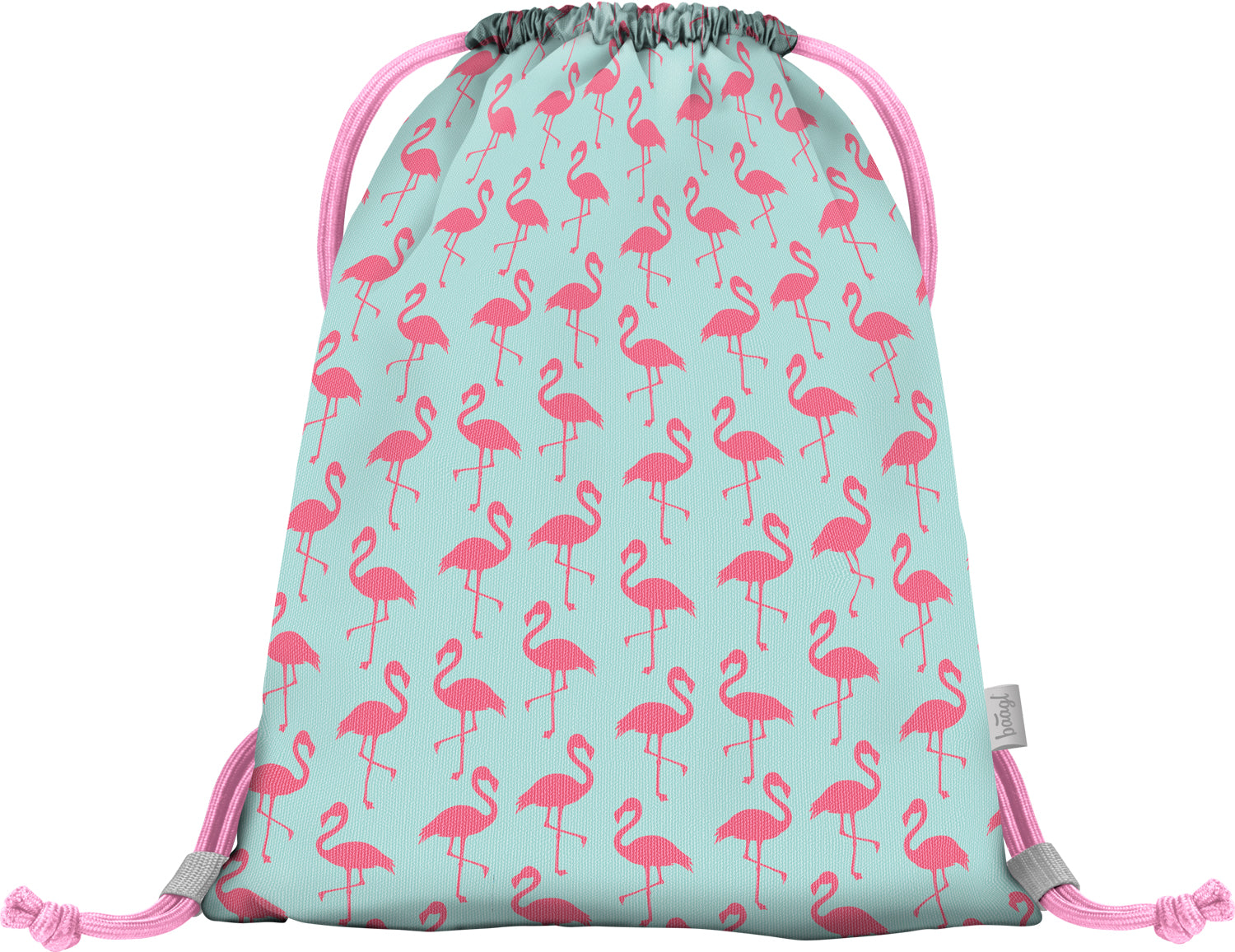Gym bag in mint green and pink with flamingoes print and practical pocket on the front.