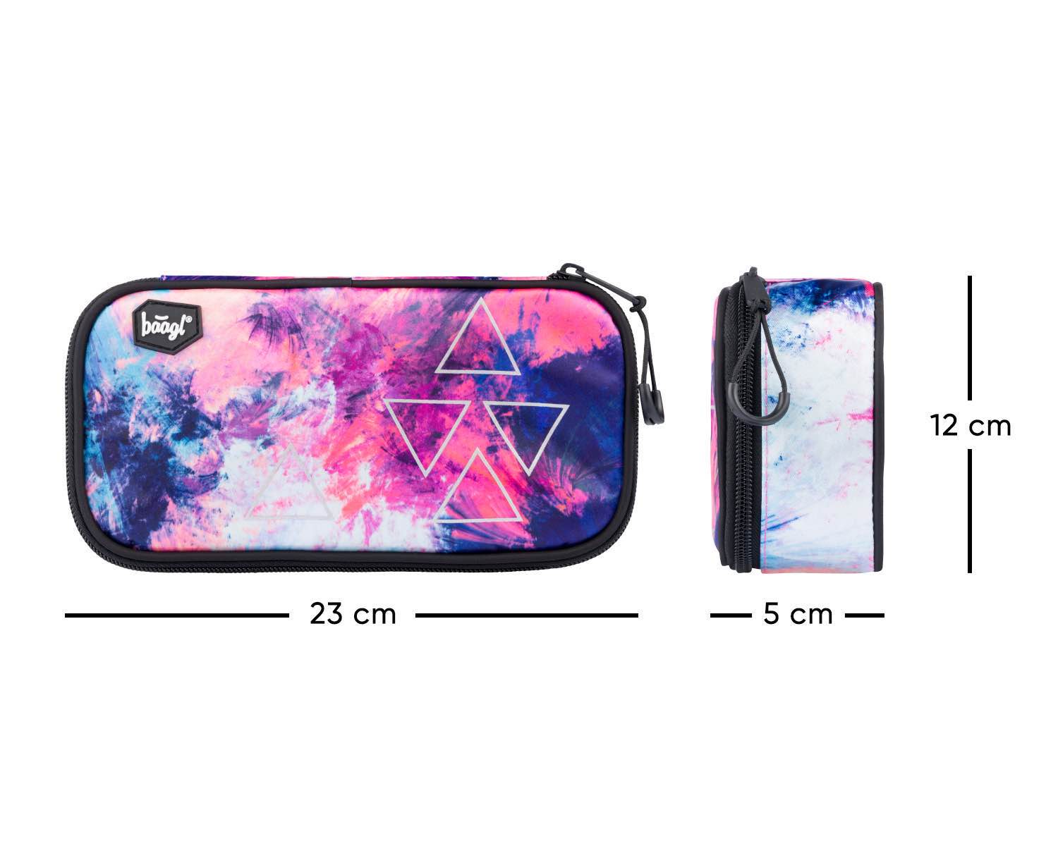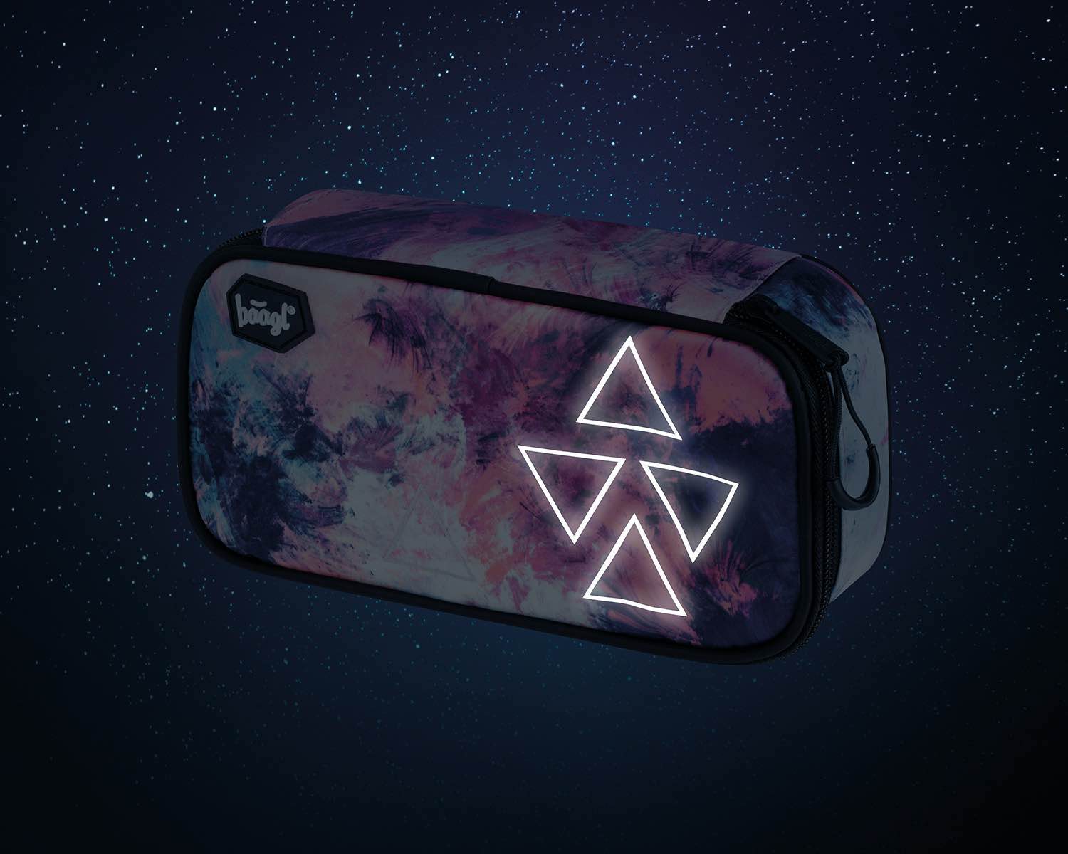 Girls’ purple-pink pencil case made of satin material, with reflective triangle print.