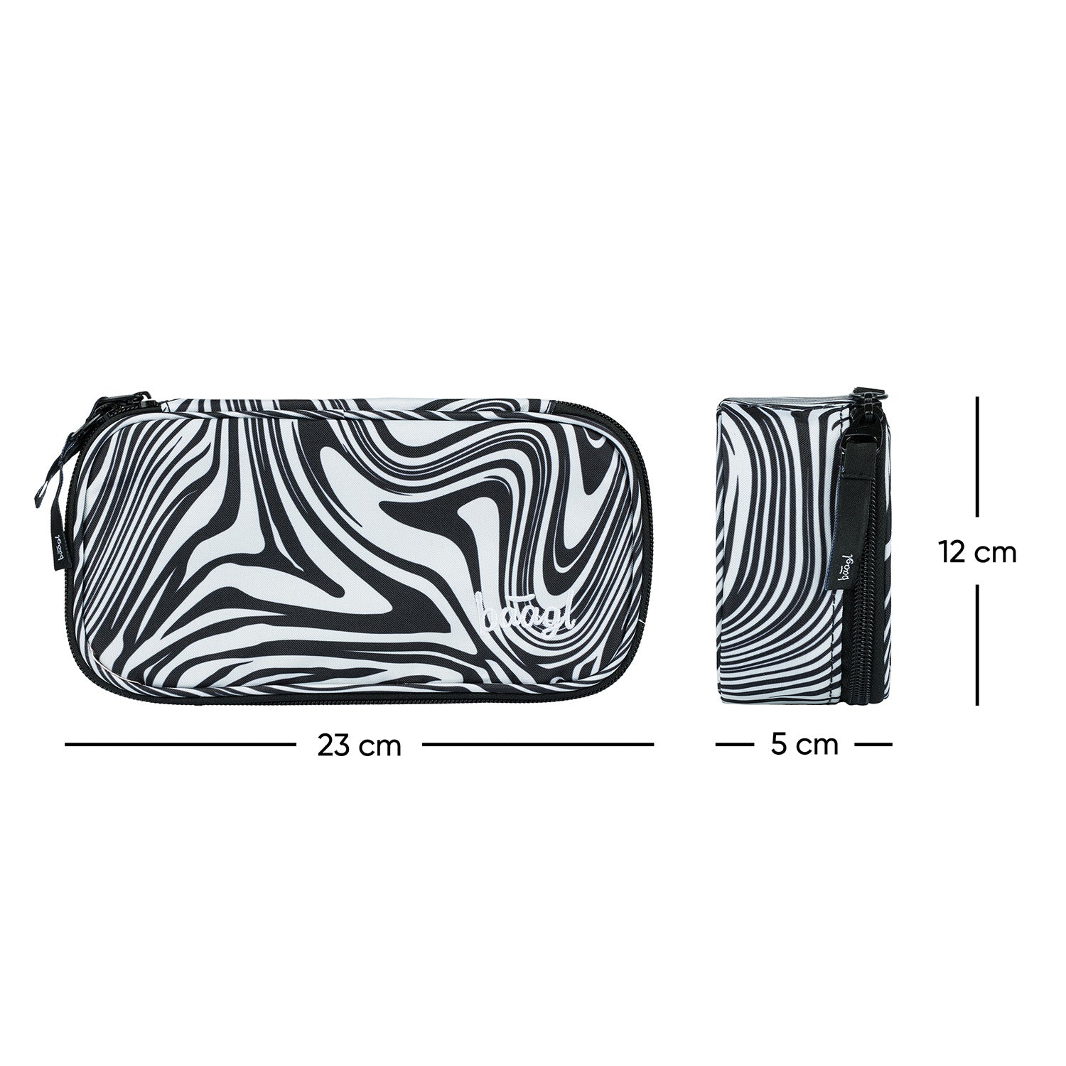 Black and white sturdy pencil case with double flip-up flap, secured with high quality zipper.