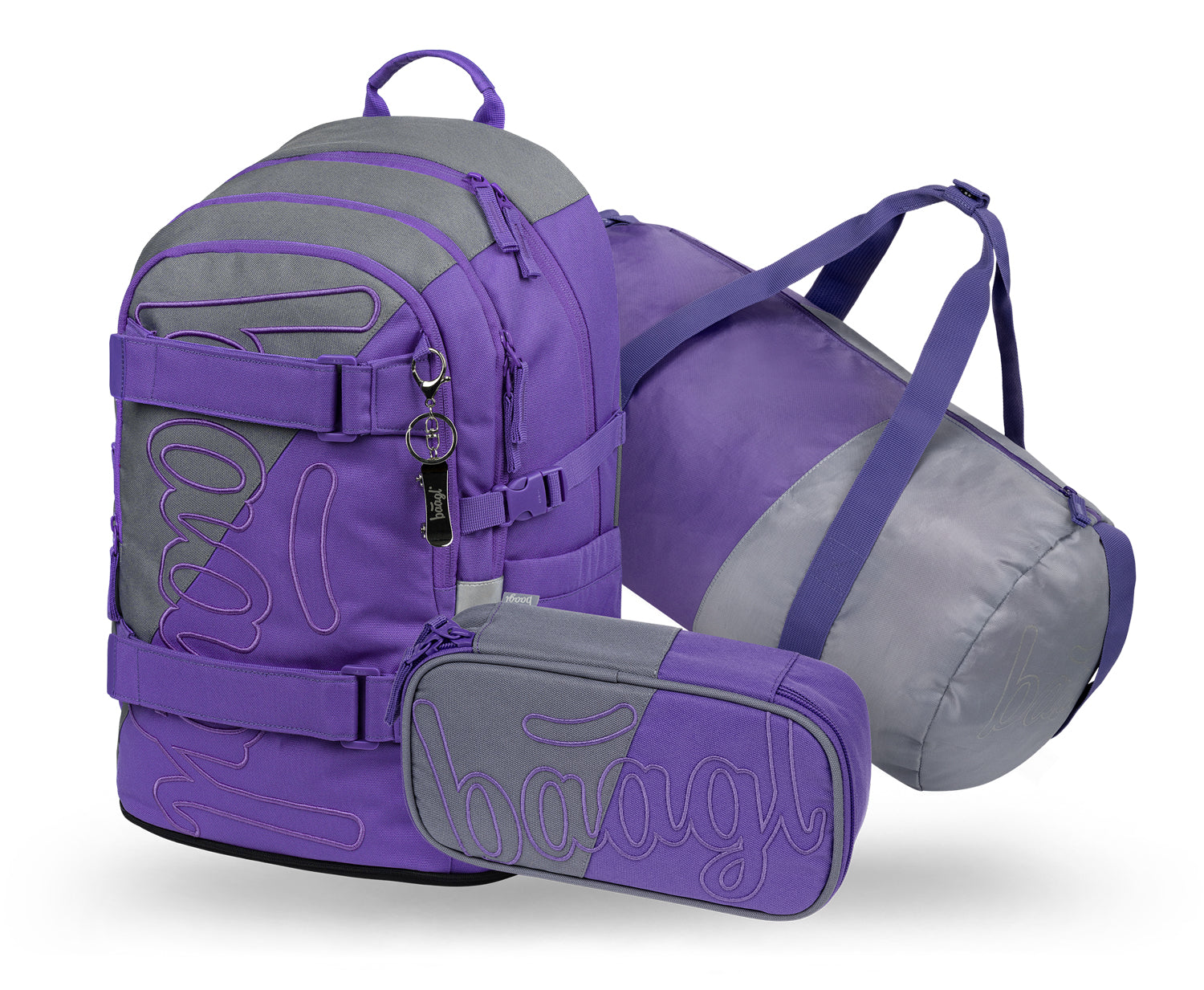 This great-value Dual set features the Skate backpack with skateboard straps, the folding Hoop sports bag, and the trendy Snap crossbody bag in an attractive grey and purple colourway.