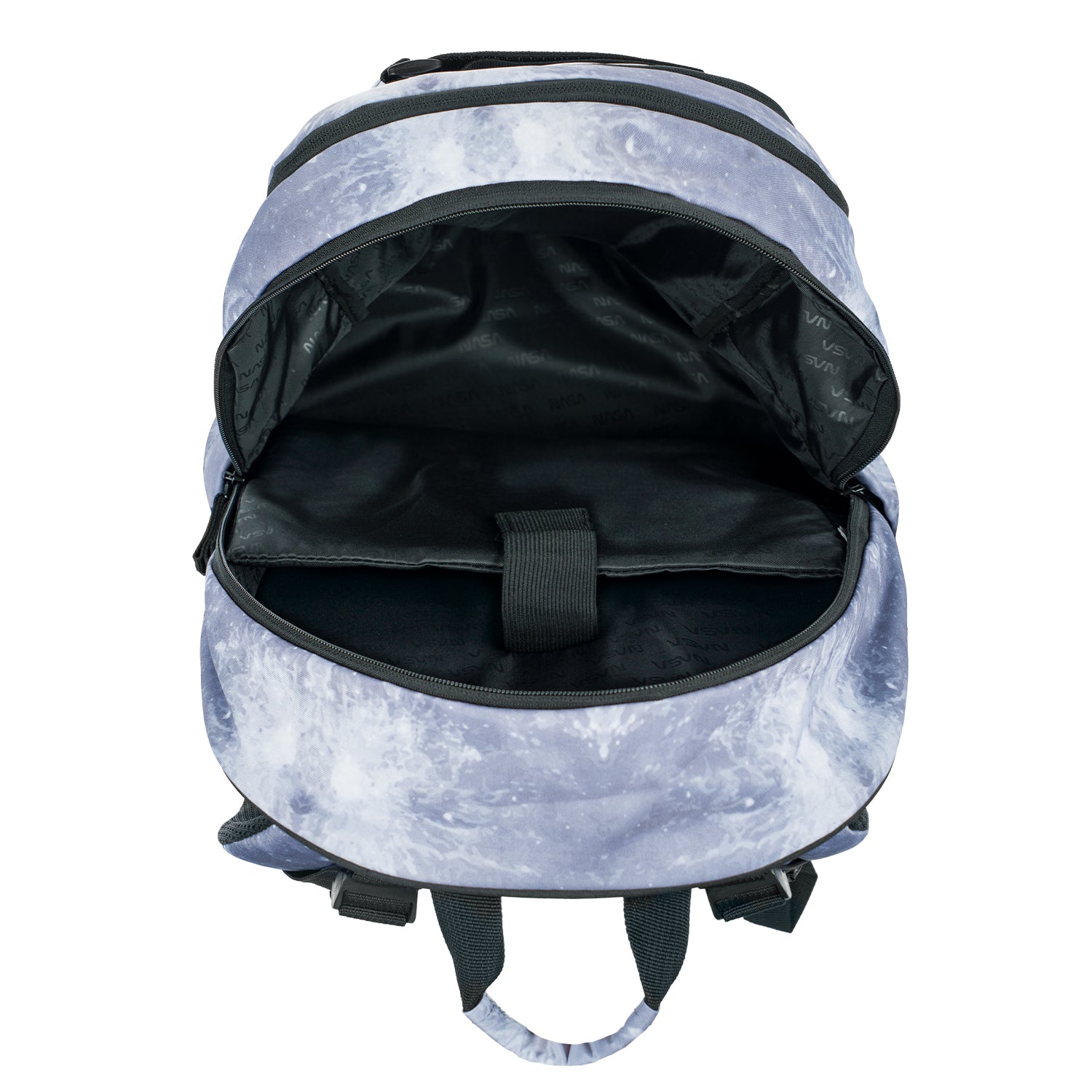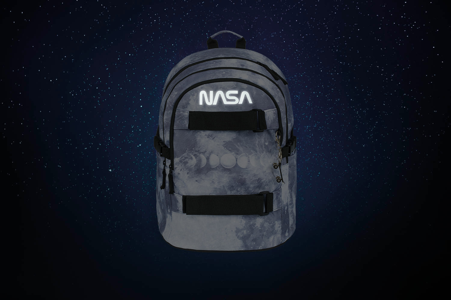 This value-for-money school set includes a light grey Skate backpack, pencil case, and shoe bag with a moonscape motif.