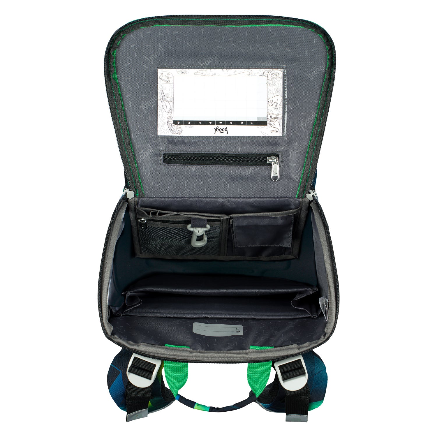 • The bag has an innovative new folding opening system, which makes it easier for students to see and access the contents directly from the desk.