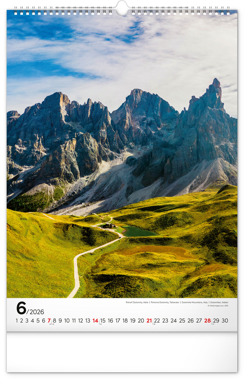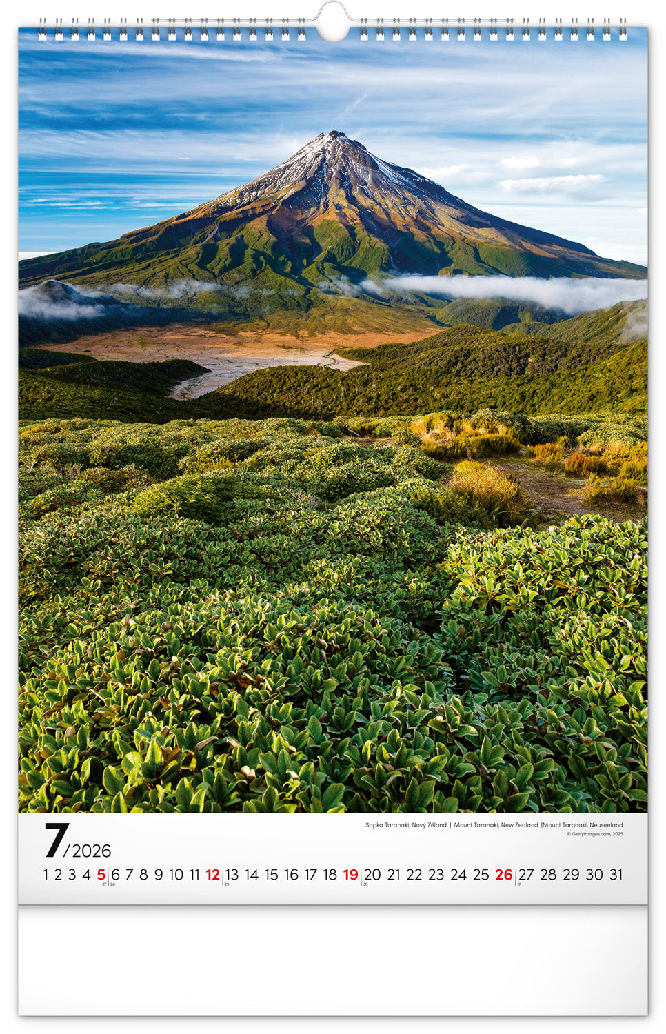 This wall calendar in an attractive vertical format contains photographs of majestic mountains from New Zealand, Iceland, France or the USA. The photographs are accompanied by a simple calendar.